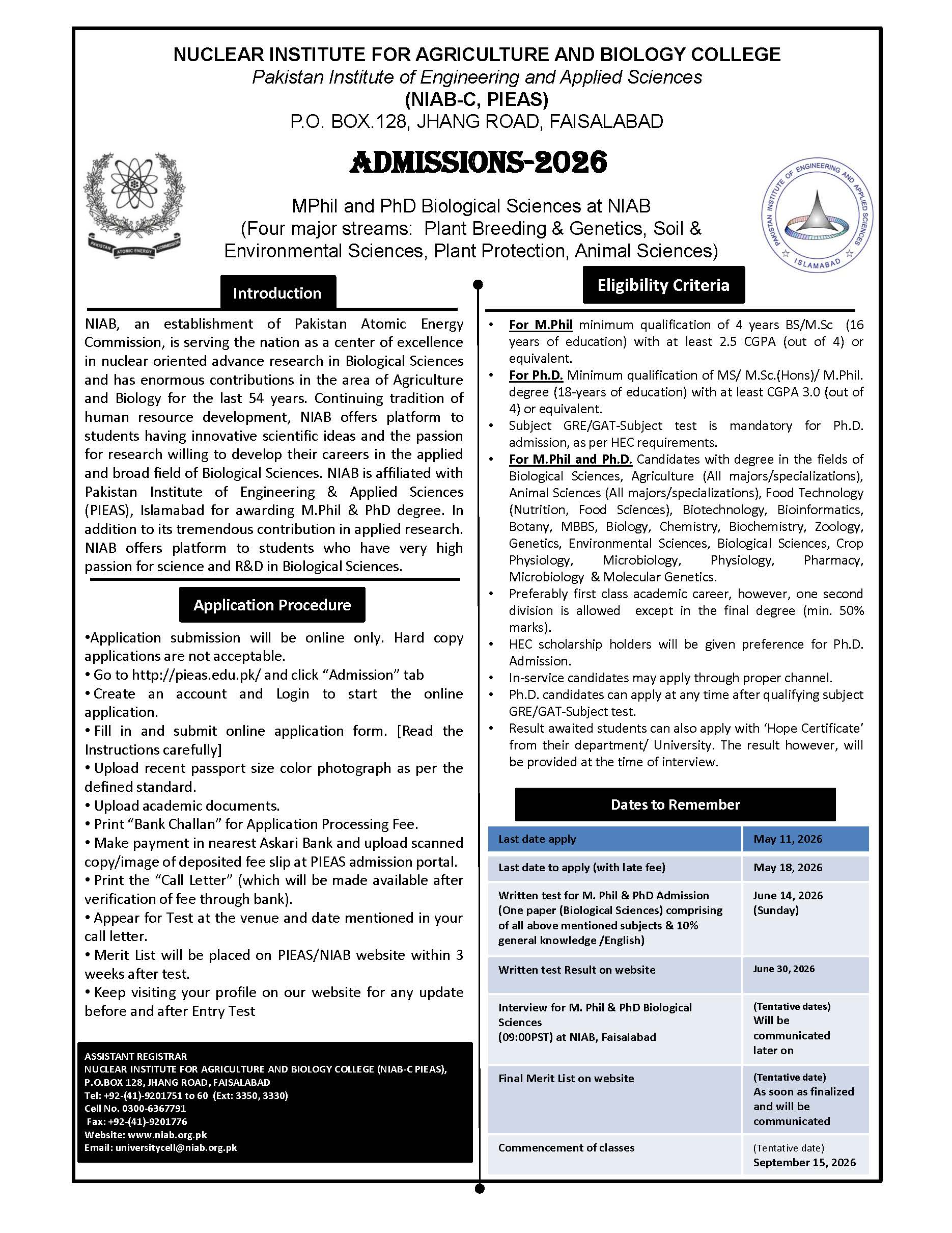 FAQs Apply Online International Students Information Leaflet for MS Programs PIEAS Entry Test Pattern and Syllabus for MS Programs Fee Structure Advertisement Admissions 2026 NIAB-C Advertisement Admissions 2026